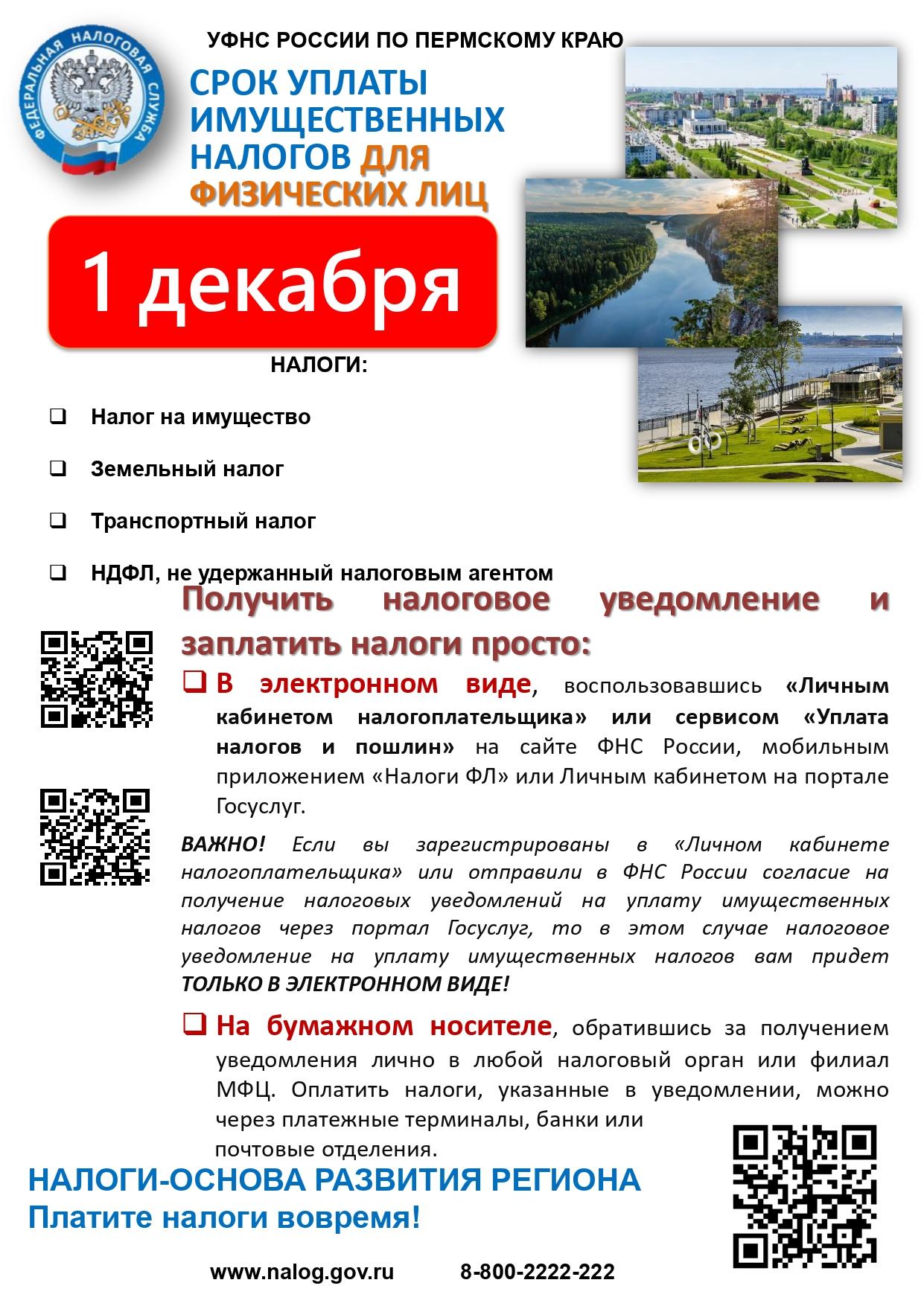 УФНС России по Пермскому краю напоминает, что срок уплаты имущественных налогов для физических лиц 1 декабря.